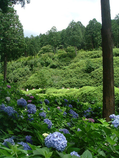 三室戸寺は別名「あじさい寺」といわれています。しかし、庭園は山全体を覆わんばかりの広大さで、本堂のあるお寺の境内とは別の雰囲気で、まるで洋風庭園のように感じさせてもくれました。山と渓流が織り成す景観は1万株のあじさいとよくマッチしています。